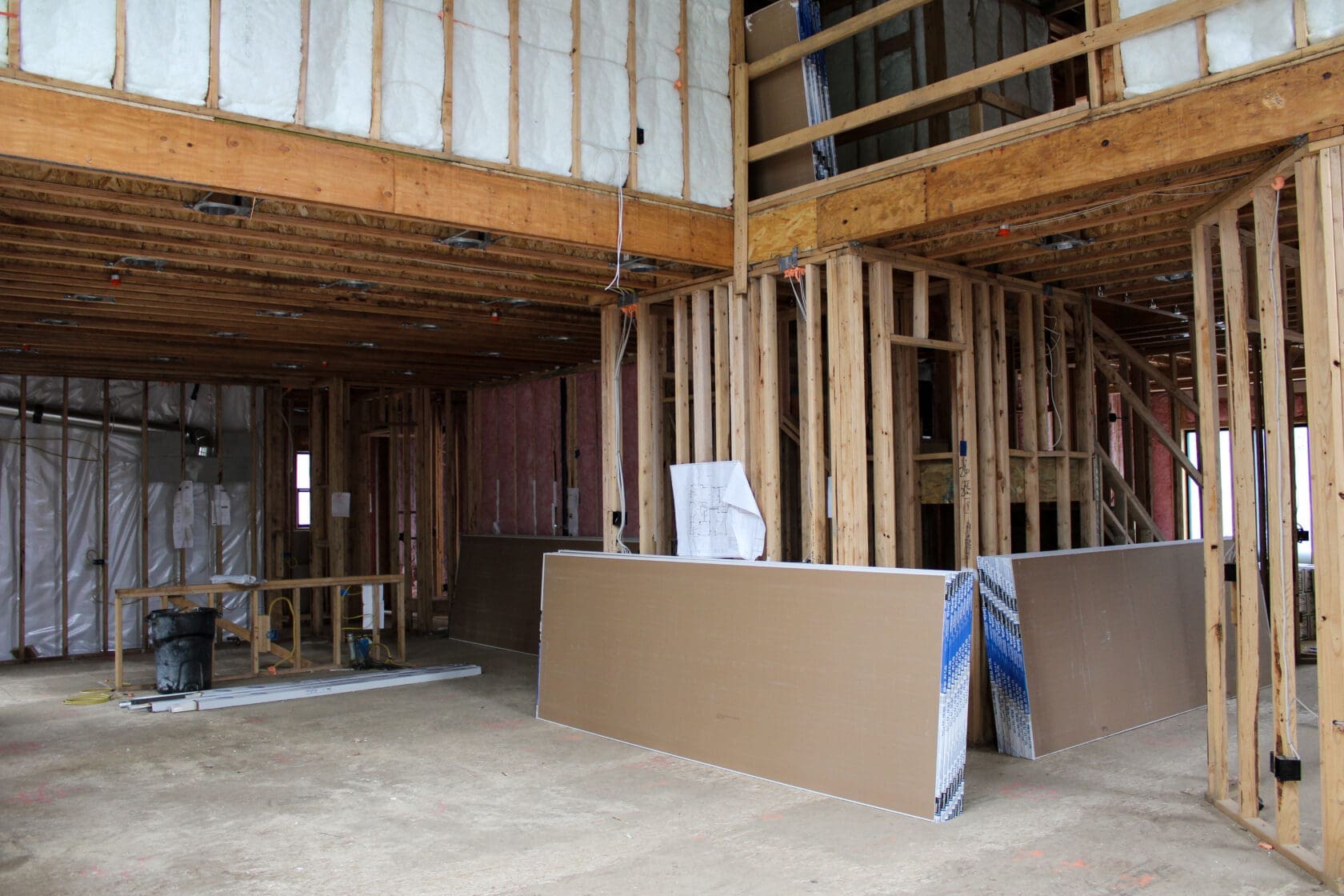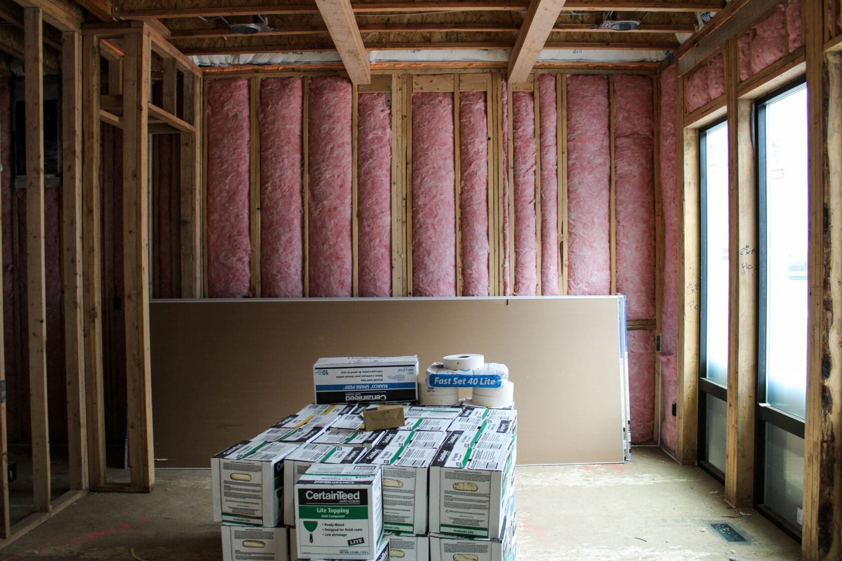 Like the Clyde Hill home, this home is starting to come together – just a day or two behind. Walking through the house, it feels a little less of a shell with the pink tufts of insulation lining the walls. Stacks of materials hint at more progress around the corner.