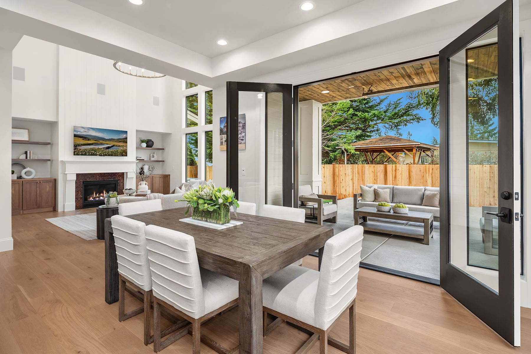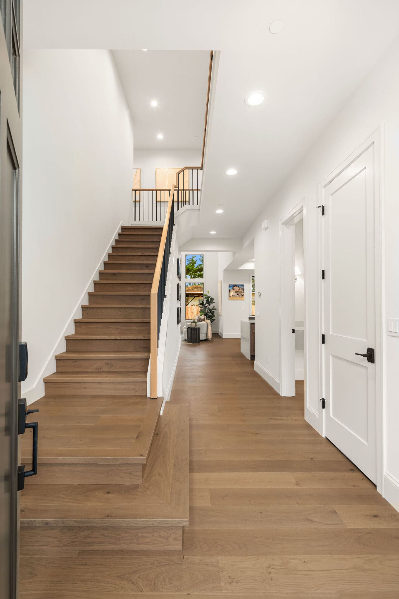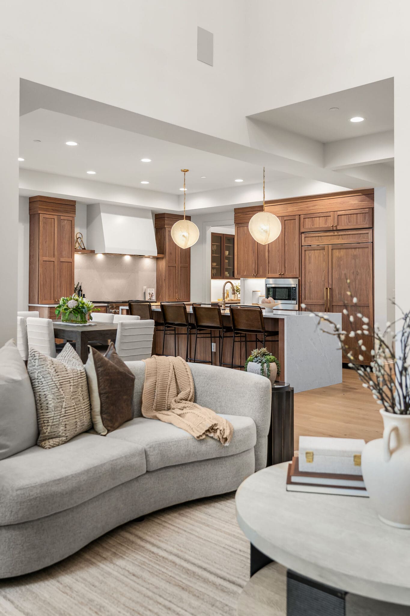 Thoughtfully designed for everyday living, this home features a spacious two-story great room that connects seamlessly to a designer chef’s kitchen with luxury appliances. Enjoy year-round living on the private outdoor living area with heaters, looking over the private backyard. A butler’s pantry connects the kitchen to the formal dining room, making hosting simple and convenient. The main floor also includes a private guest suite with its own en suite bath and a two-car garage with an adjoining mudroom.