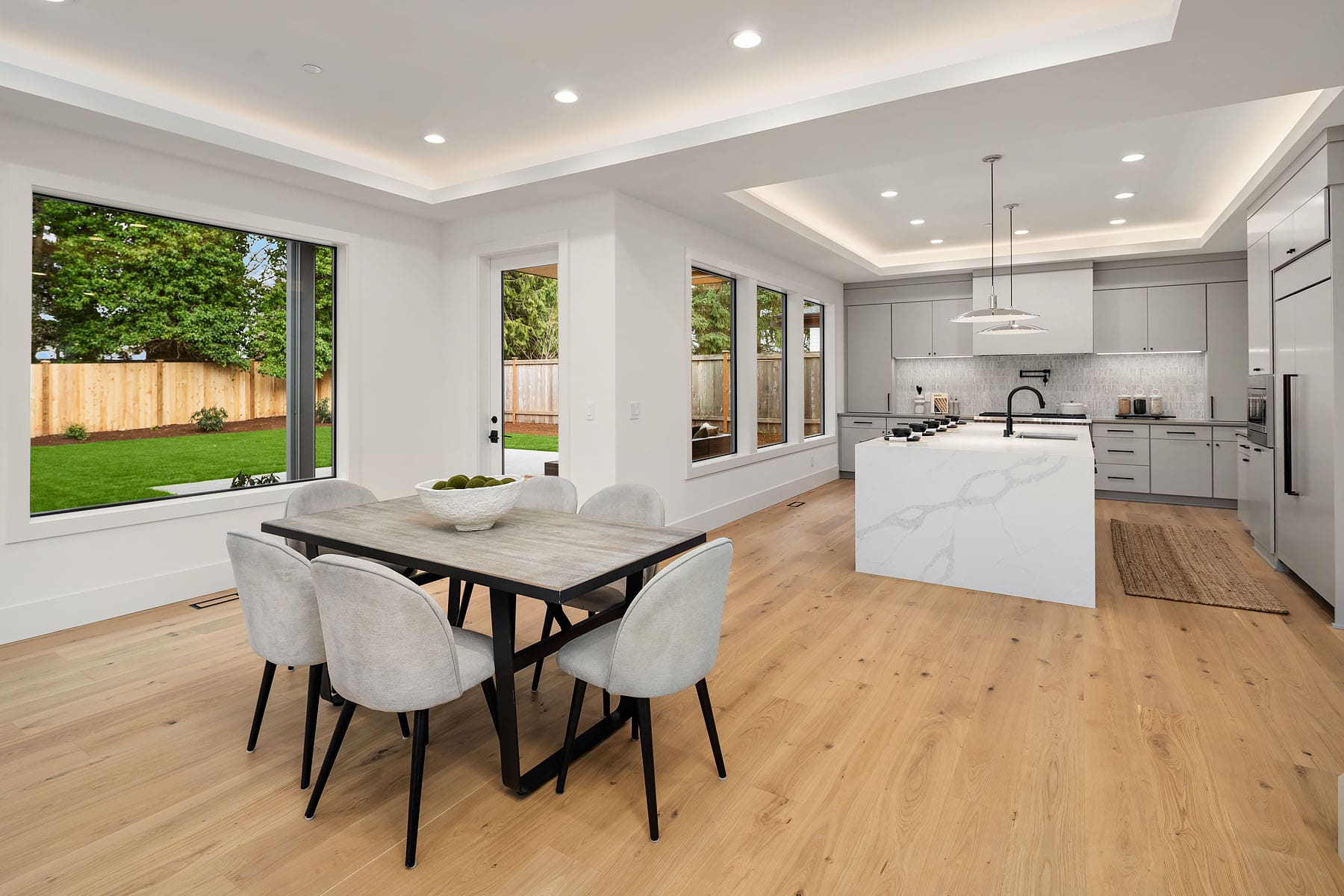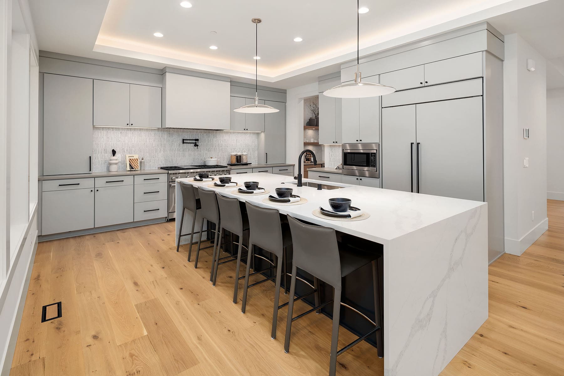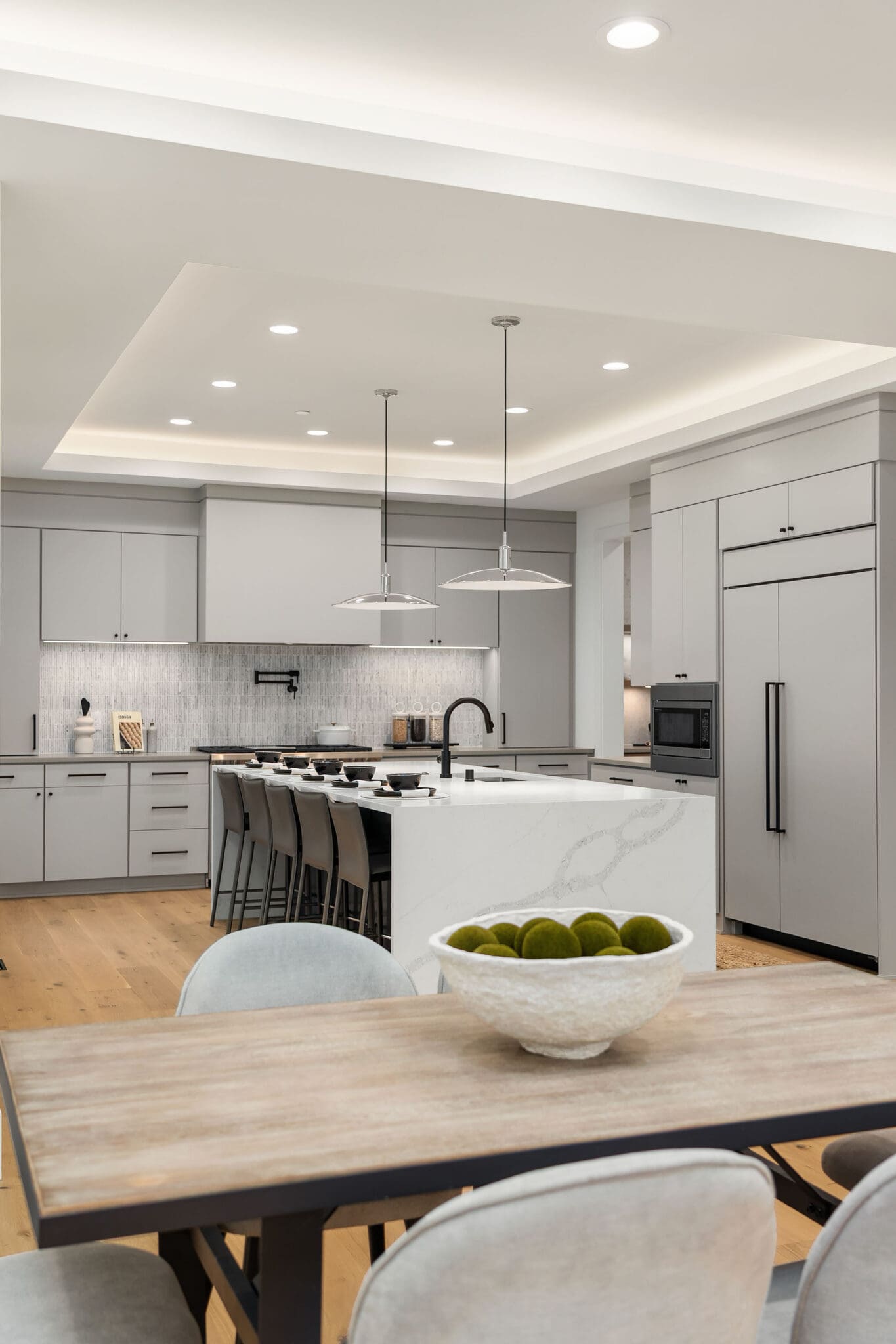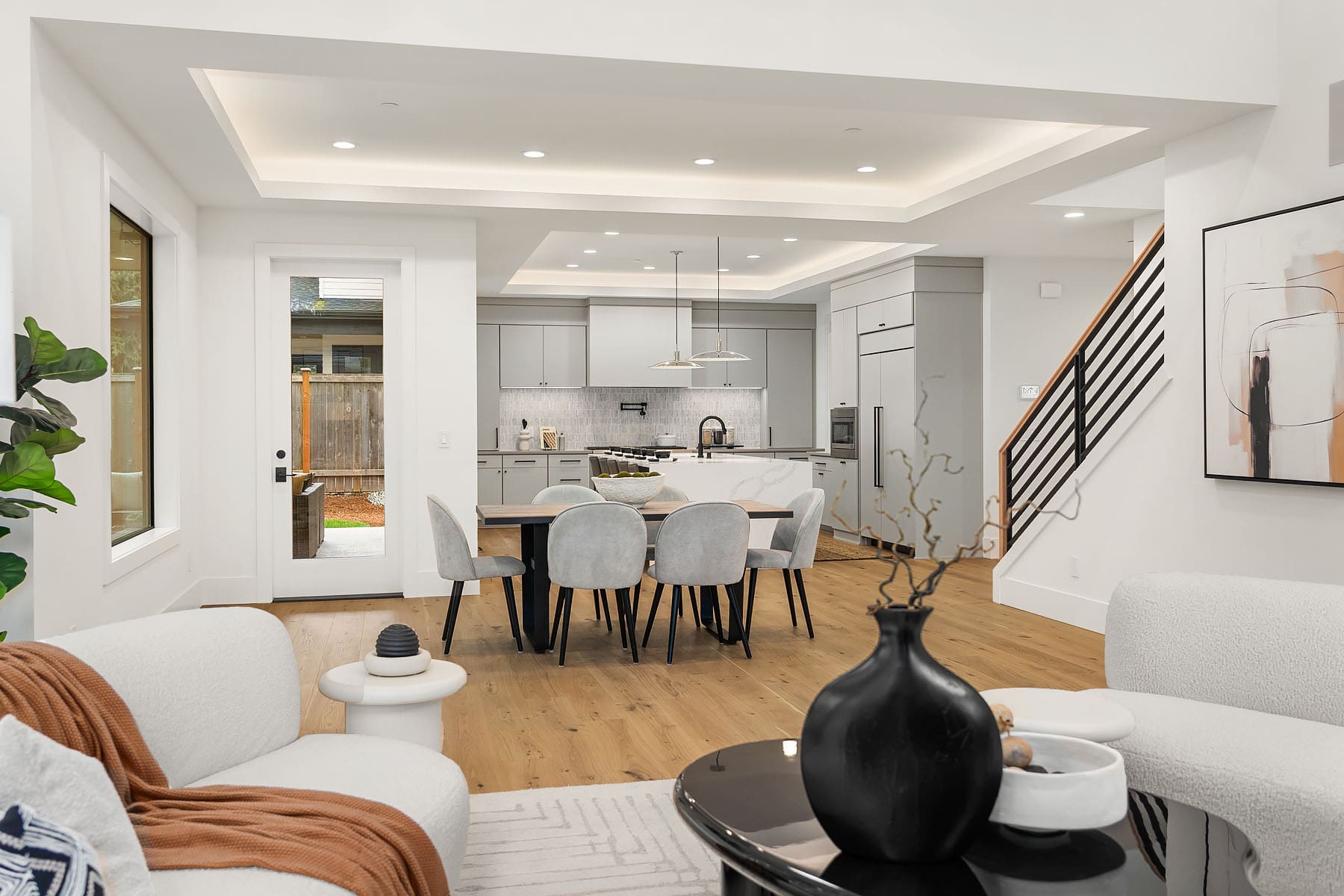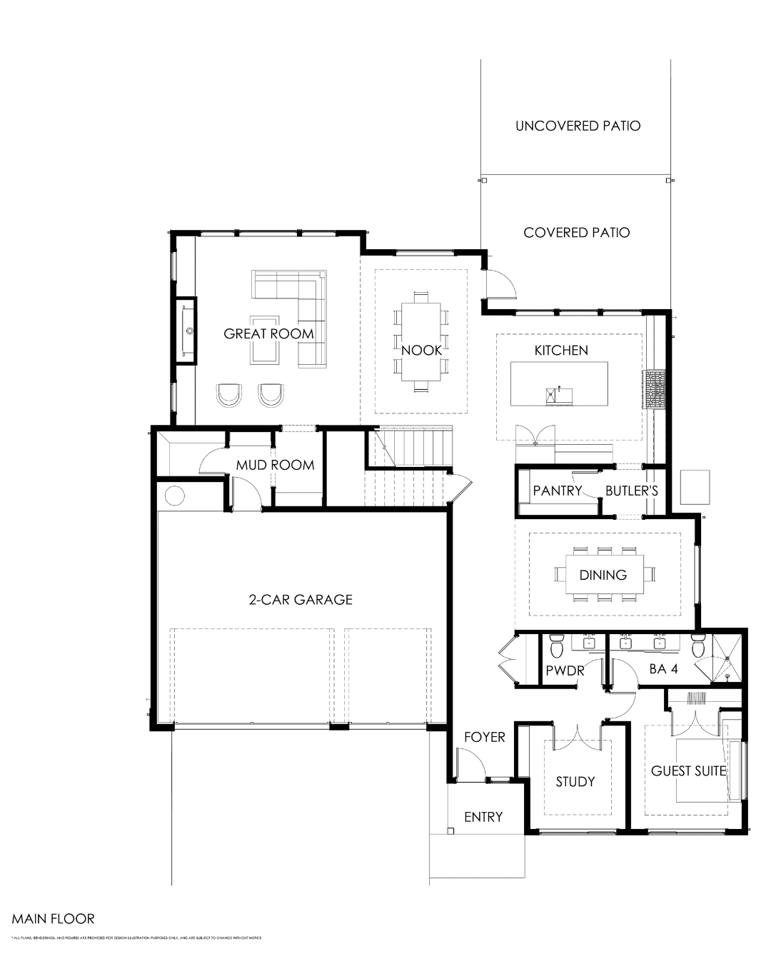 Thoughtfully designed for everyday living, this home features a spacious two-story great room that connects seamlessly to a designer chef’s kitchen with luxury appliances. Enjoy year-round living on the private outdoor living area with heaters, looking over the private backyard. A butler’s pantry connects the kitchen to the formal dining room, making hosting simple and convenient. The main floor also includes a private guest suite with its own en suite bath, dedicated den and a two-car garage with an adjoining mudroom.