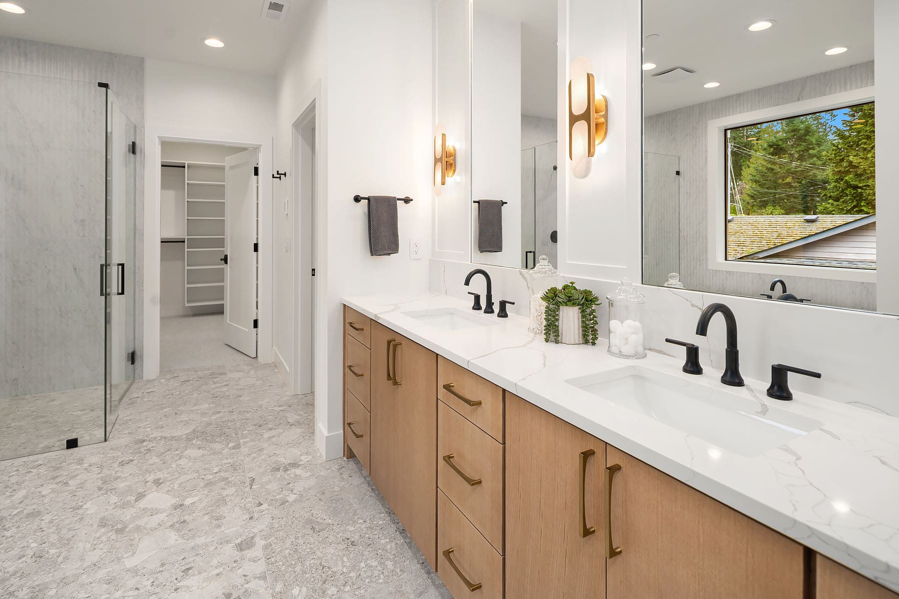 - Designer primary suite with five-piece bath, heated floors, and connected laundry