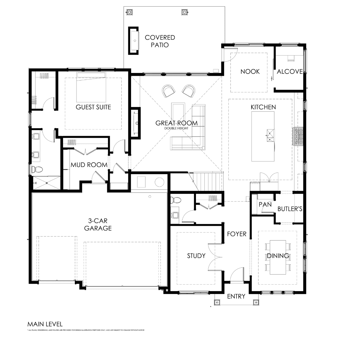Perfect for both entertaining and everyday living, this home features a spacious two-story great room that flows seamlessly into a chef’s kitchen with luxury appliances. Enjoy year-round living on the private covered patio with a fireplace. A butler’s pantry connects the kitchen to the formal dining room, making hosting simple and convenient. The main floor also offers a guest suite with an en suite bath, a dedicated den for office space, and a spacious 3-car garage with an adjoining mudroom.