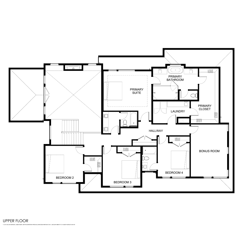 - Designer primary suite with five-piece bath and connected laundry